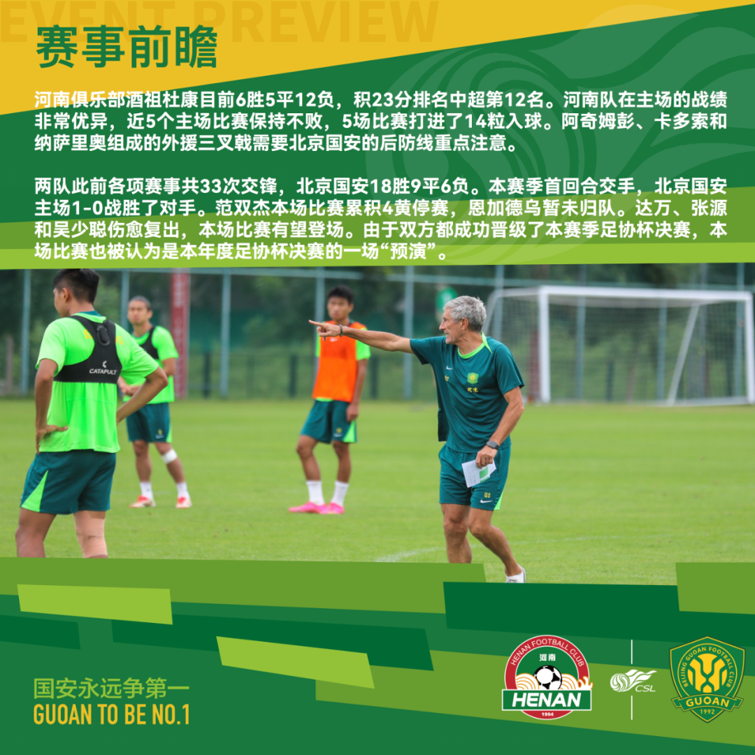 主教练塞蒂恩在发布会上说:“我们一直很期待这场比赛的到来,因为所有人都希望用本场比赛的表现,去把上一场比赛的阴霾一扫而尽。我们在准备过程中尽了自己全部努力,我们希望本场比赛能拿到想要的分数,因为我们需要积分来保证一直在积分榜上有利位置。河南队是一支很出色的球队,他们有很多有实力球员,本场比赛不会容易。”
