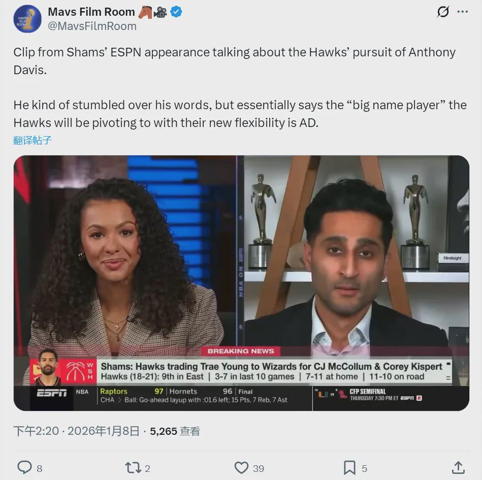 北京时间1月8日,据ESPN名记Shams报道,老鹰送走特雷杨之后,球队将加大力度追求独行侠内线安东尼-戴维斯。CJ-麦克拉姆本赛季薪水3067万美元,今年夏天合同到期。此外,老鹰阵中的波尔津吉斯和肯纳德等都是到期合同。
