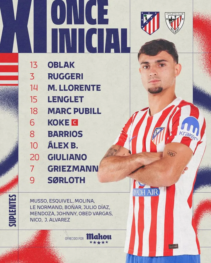 马德里竞技替补:4-门多萨、5-卡尔多索、16-莫利纳、19-阿尔瓦雷斯、21-巴尔加斯、23-尼古拉斯-冈萨雷斯、24-勒诺尔芒、32-博纳、34-胡利奥-迪亚兹