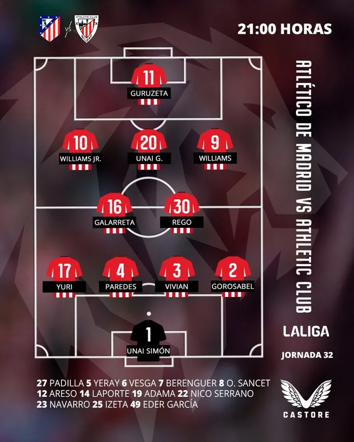 毕尔巴鄂竞技首发:1-乌奈-西蒙、17-贝尔奇切、4-艾托-帕雷德斯、3-维维安、2-戈罗萨贝尔、30-雷戈、16-加拉莱塔、10-尼科、20-乌奈-戈麦斯、9-伊纳基、11-古鲁泽塔